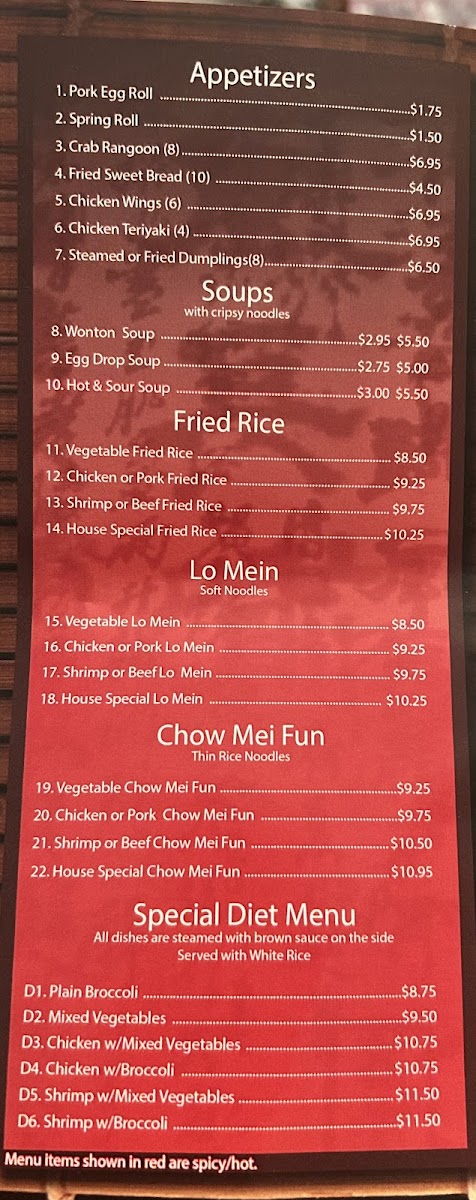 Start your meal with tantalizing appetizers like crispy Pork Egg Rolls, savory Crab Rangoon, and flavorful Chicken Teriyaki, each priced around $6.95. For those craving rice, the variety of fried rice options is bound to satisfy, ranging from Vegetable Fried Rice ($8.50) to the House Special Fried Rice ($10.25).